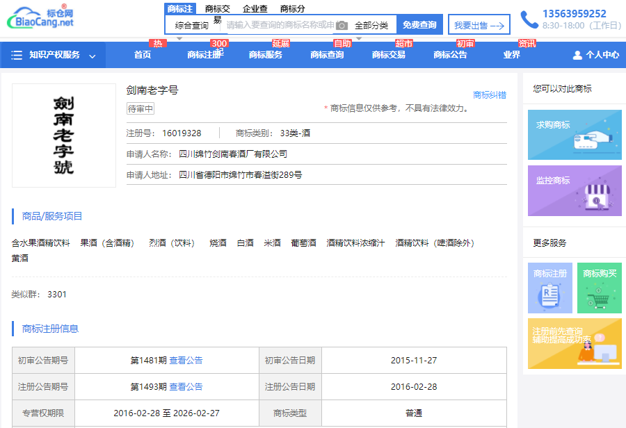 具体来看,根据该北京市高级人民法院去年12月底作出的二审判决书显示,2018年,剑南春公司申请注册第35089173号“劍南老字號 系出名门一脉相承JIANNANLAOZIHAO”商标。指定使用商品或服务第33类,包括果酒(含酒精);葡萄酒等。商标保姆注册,只要399