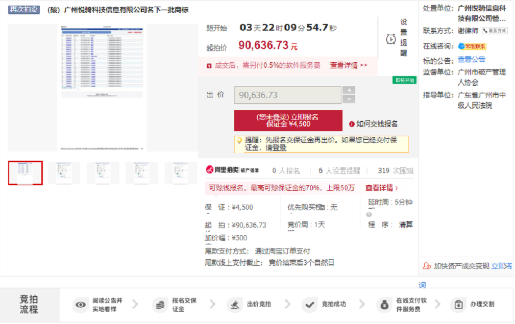 对比其他拍品,这批商标保证金仅4500元,目前181次围观,3人设置提醒,但没人报名,这个关注度显然是不高的。